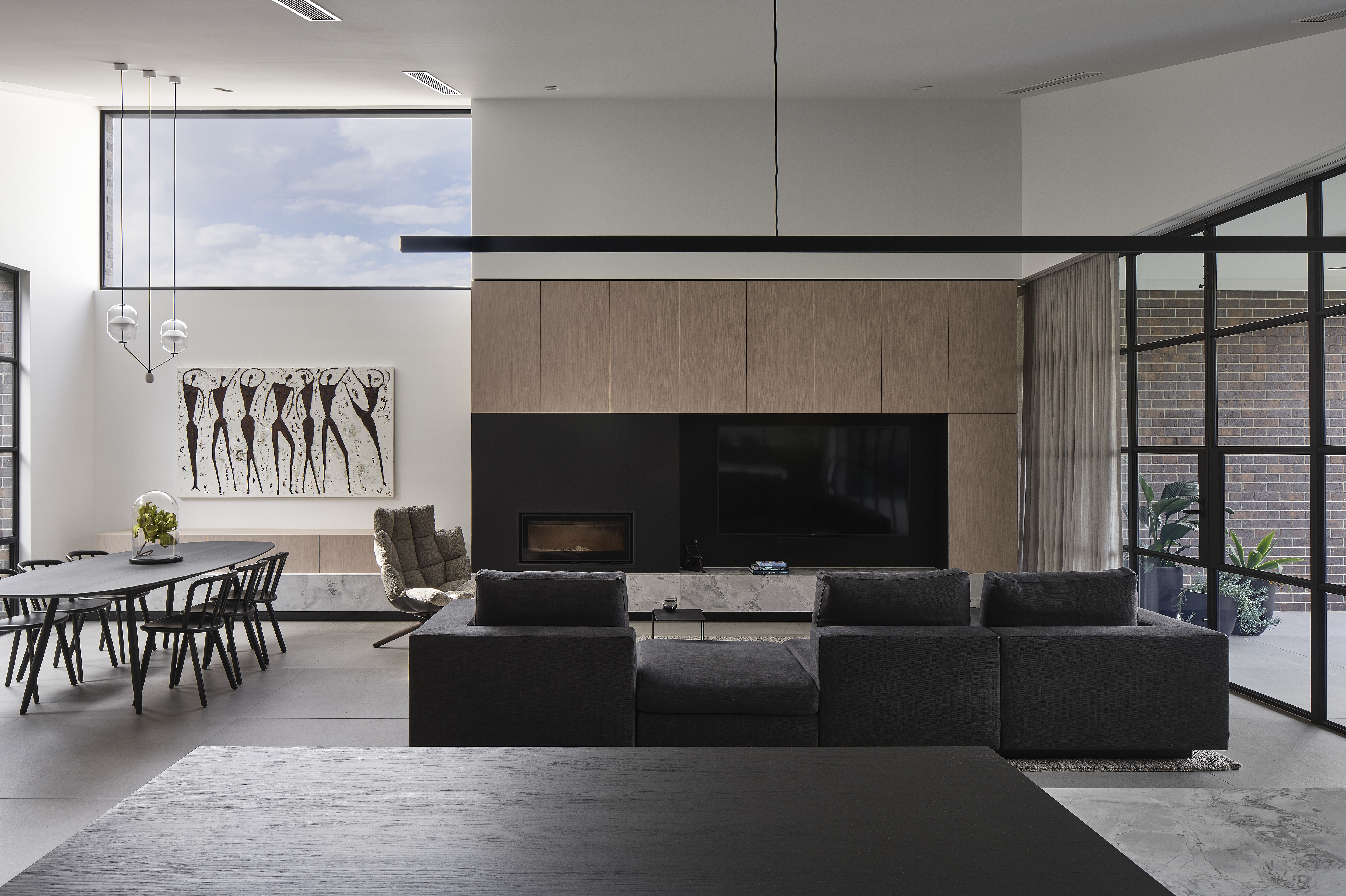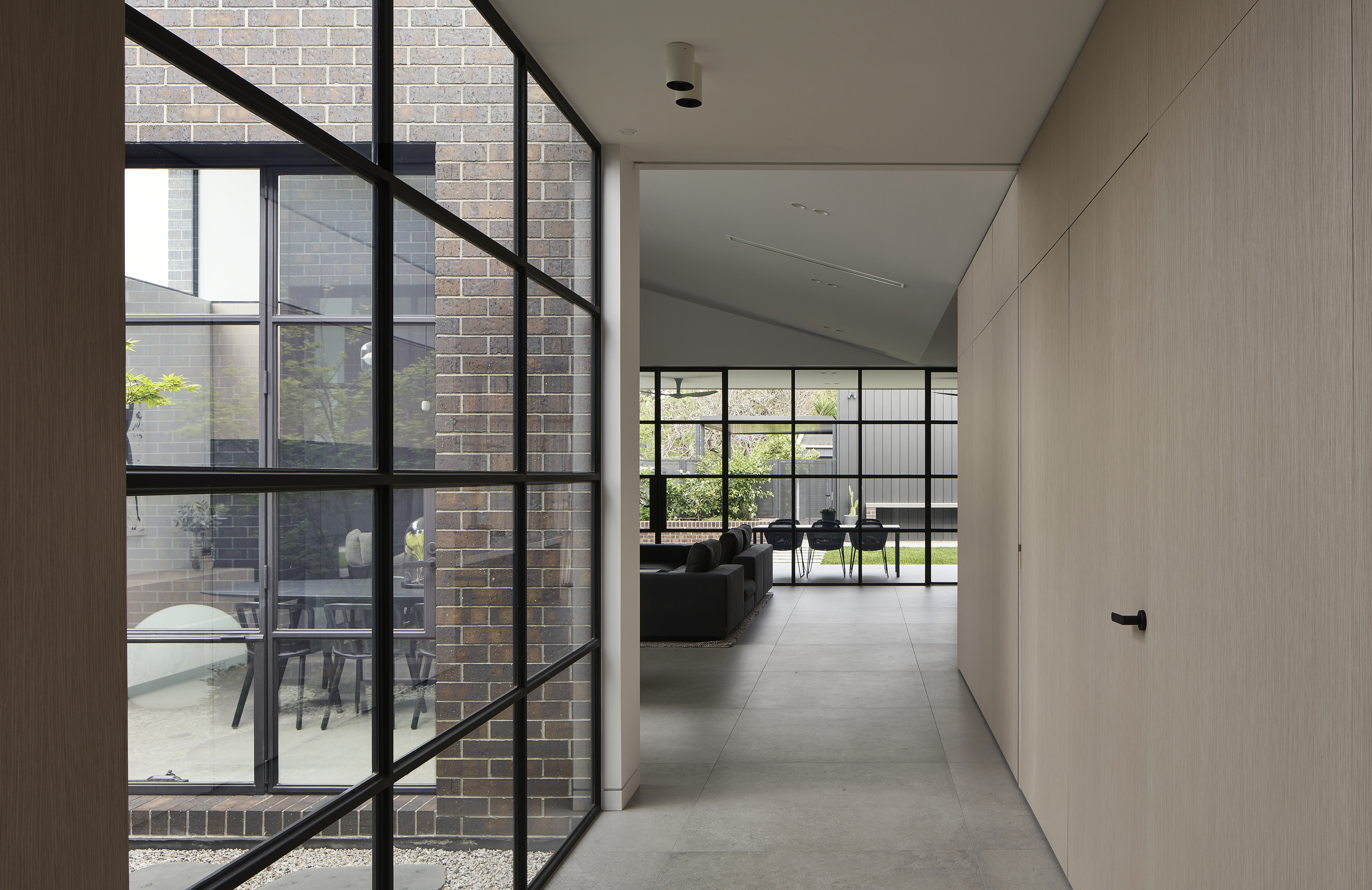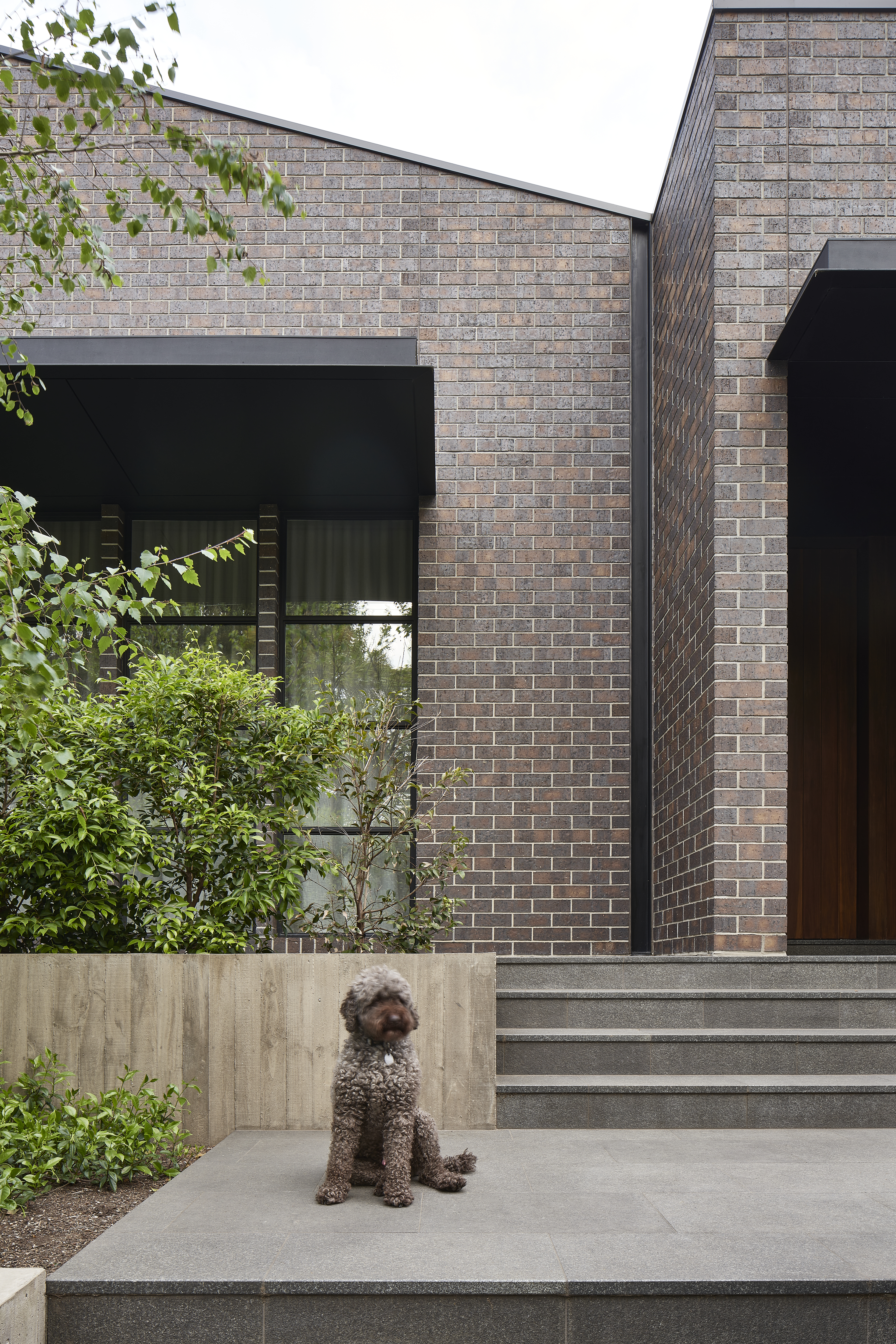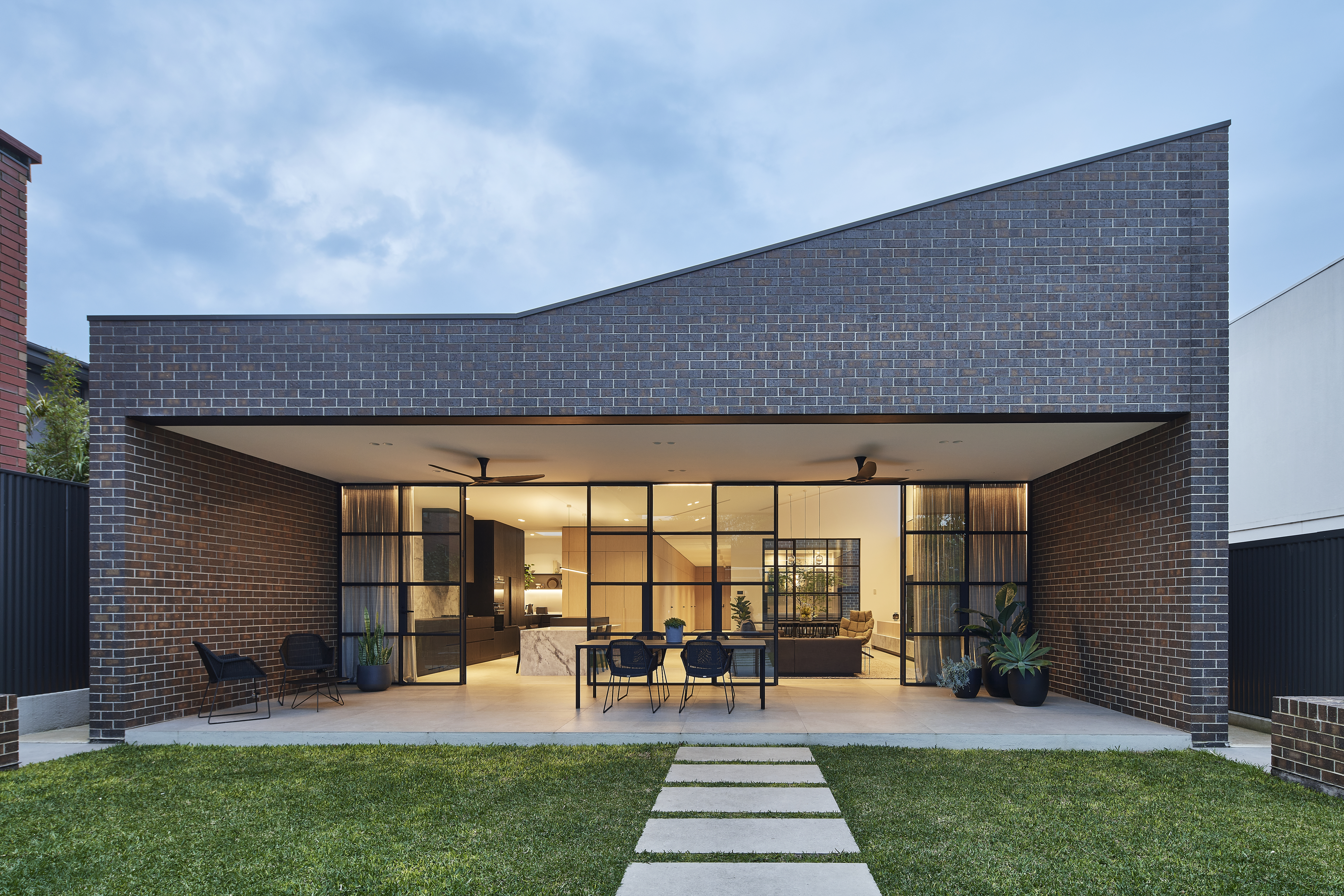 An architecturally designed single-storey new build, featuring striking face brick walls, raked ceilings, marble-detailed bathrooms, black steel windows and a strong sense of privacy.