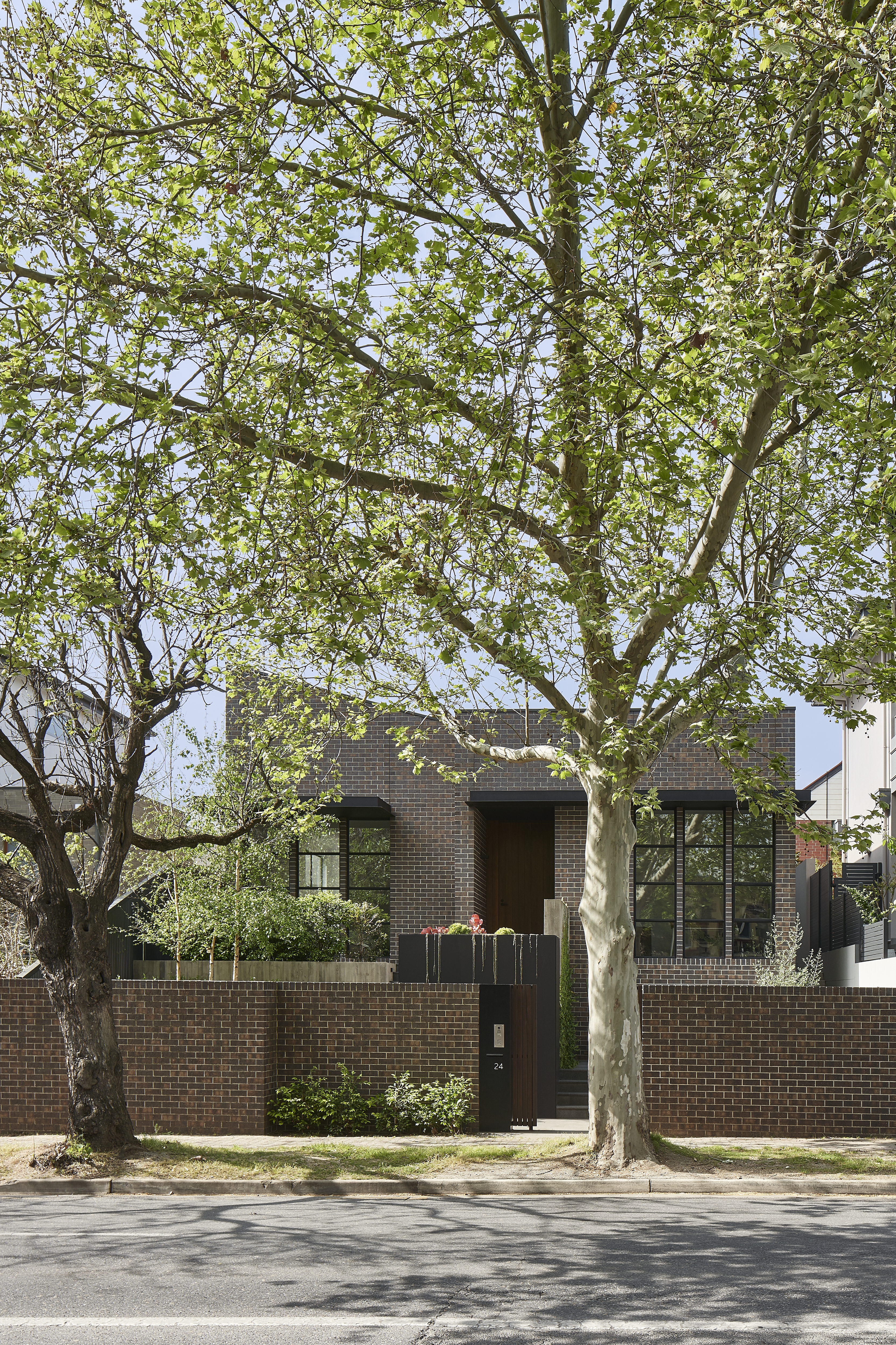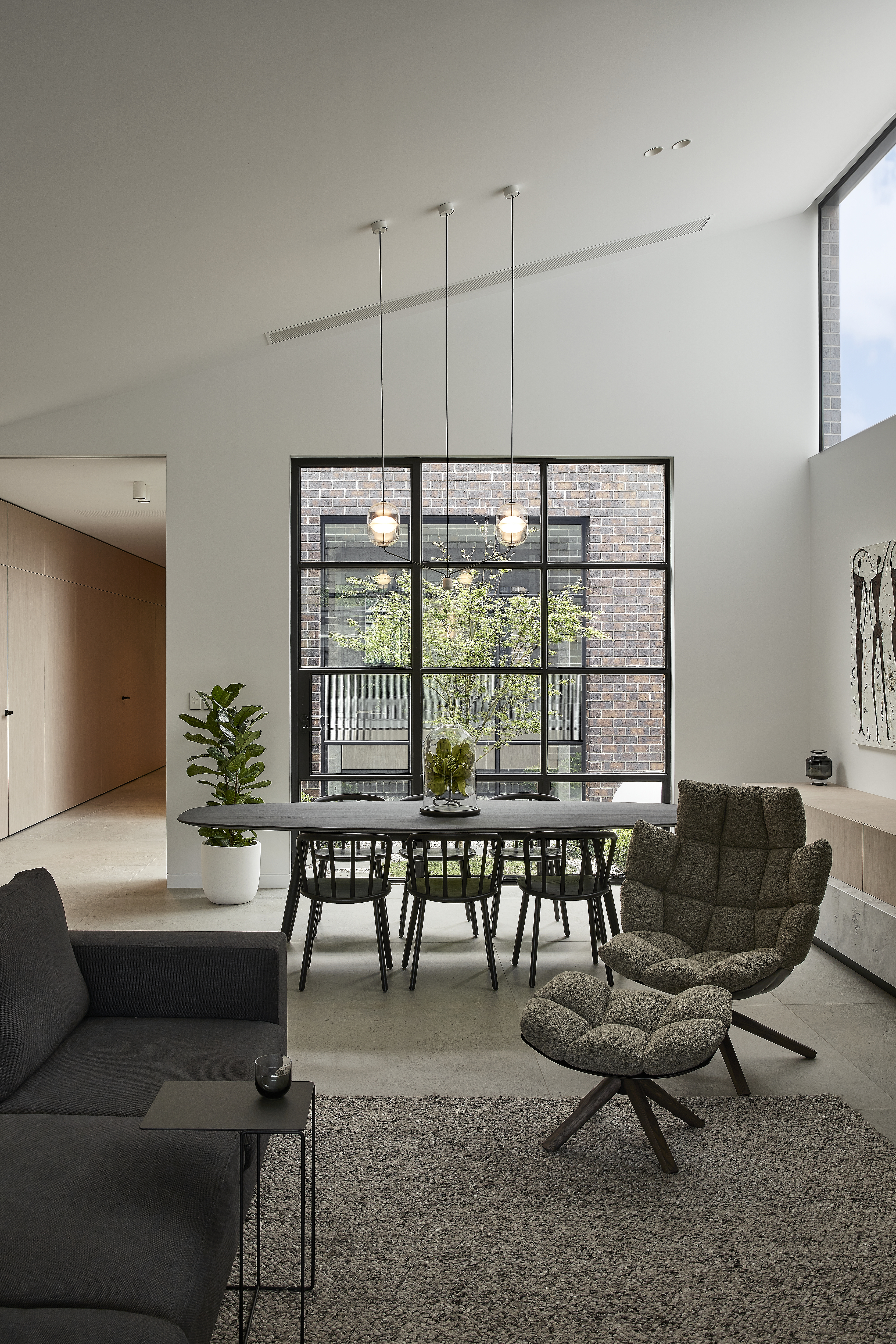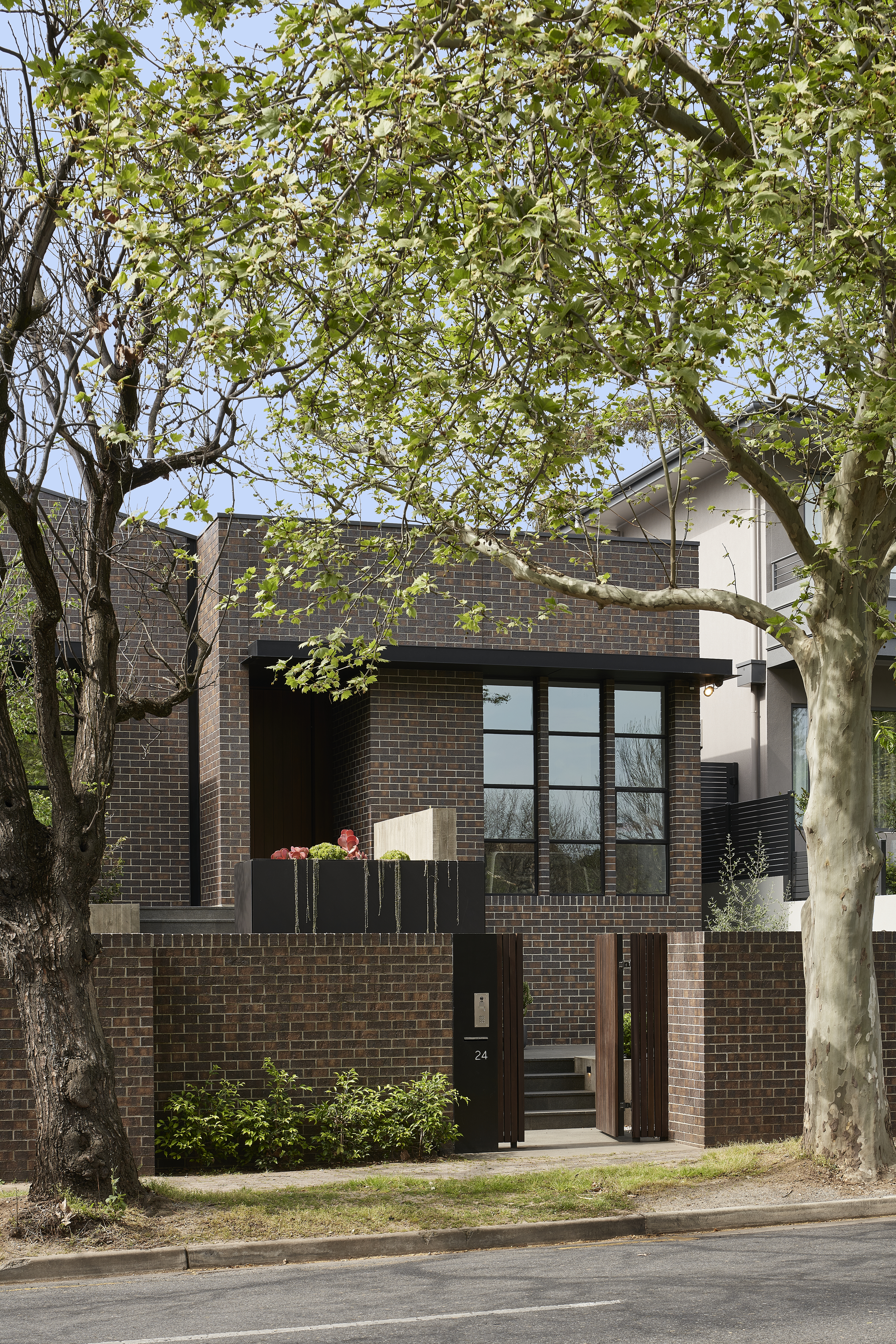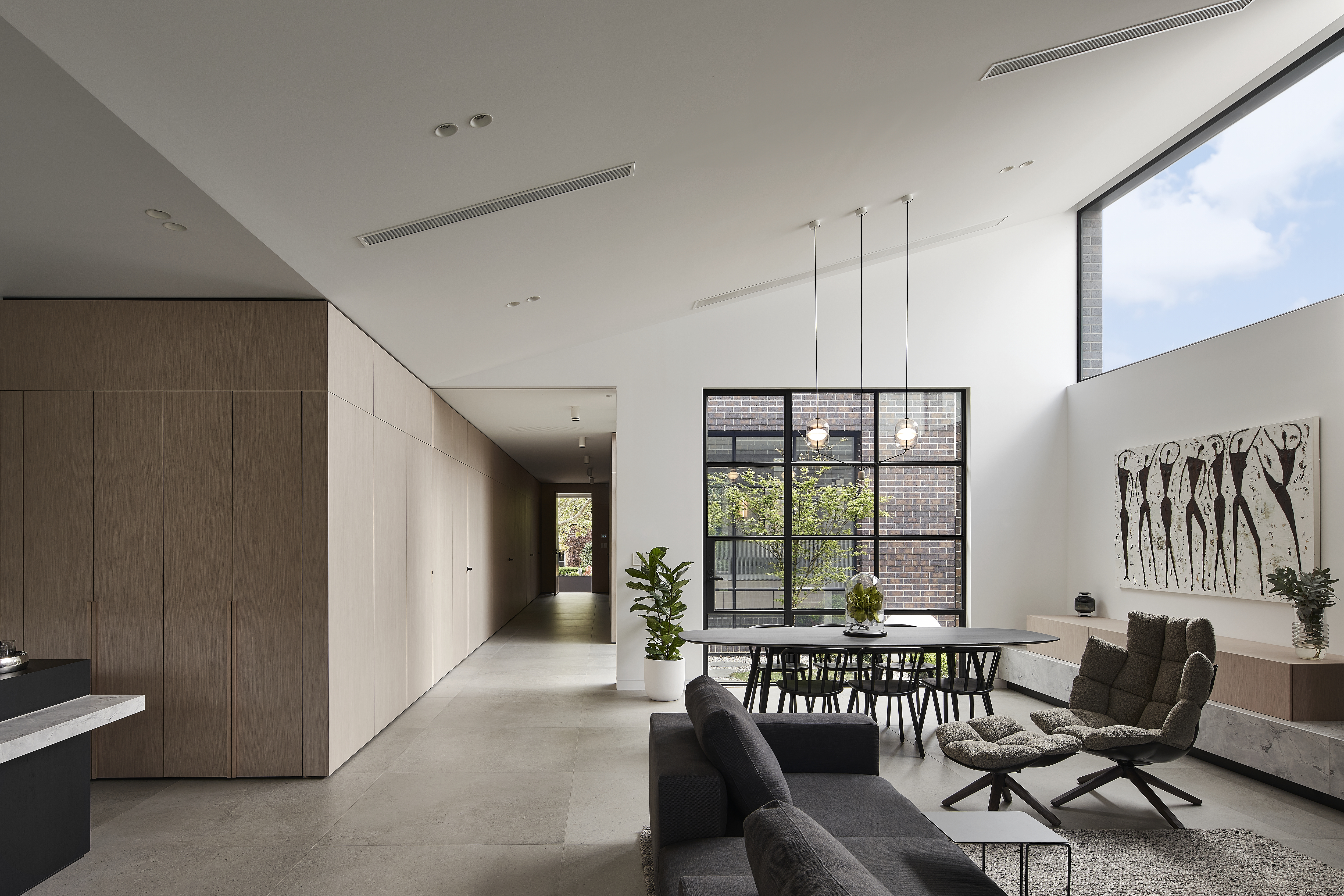 An architecturally designed single-storey new build, featuring striking face brick walls, raked ceilings, marble-detailed bathrooms, black steel windows and a strong sense of privacy.