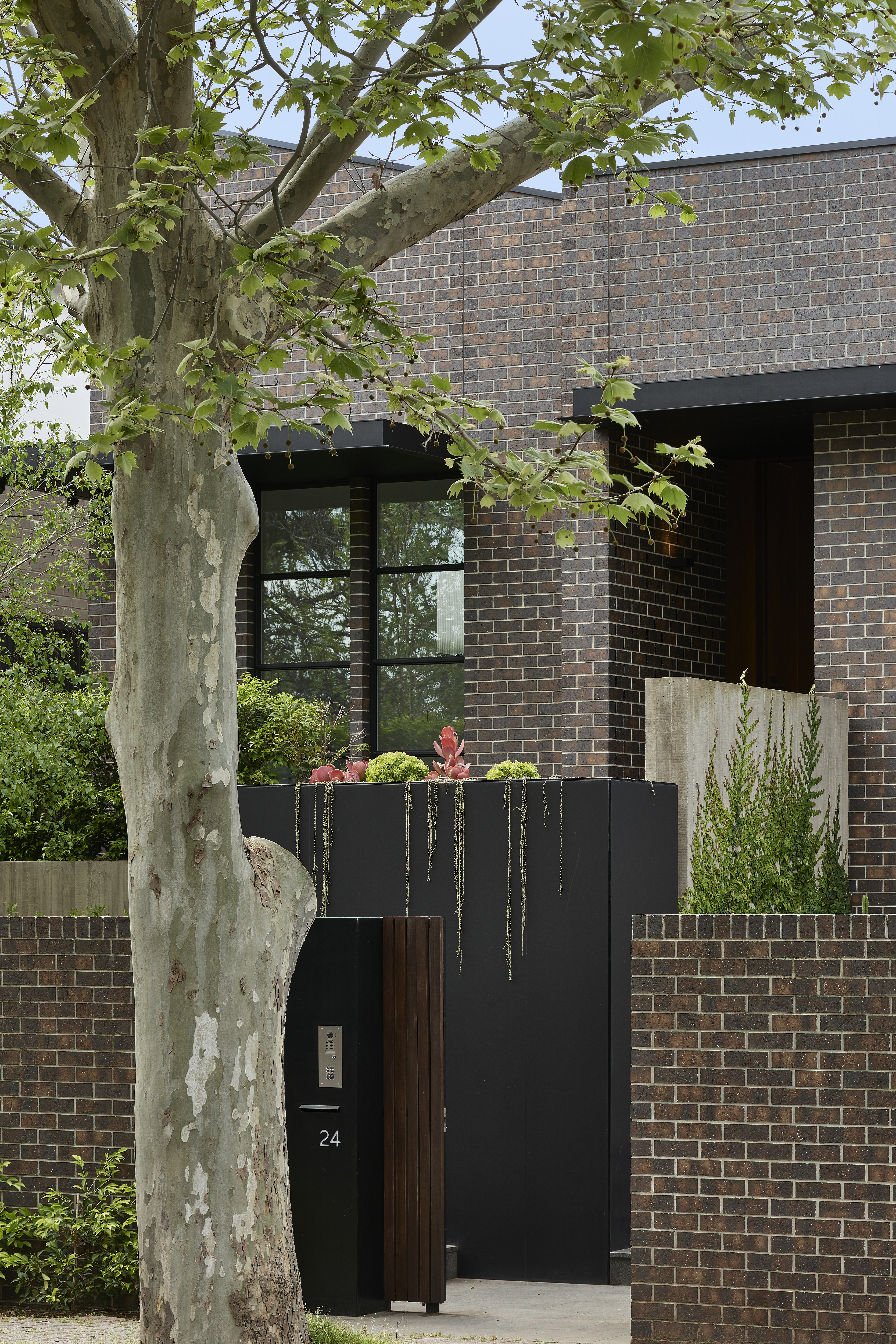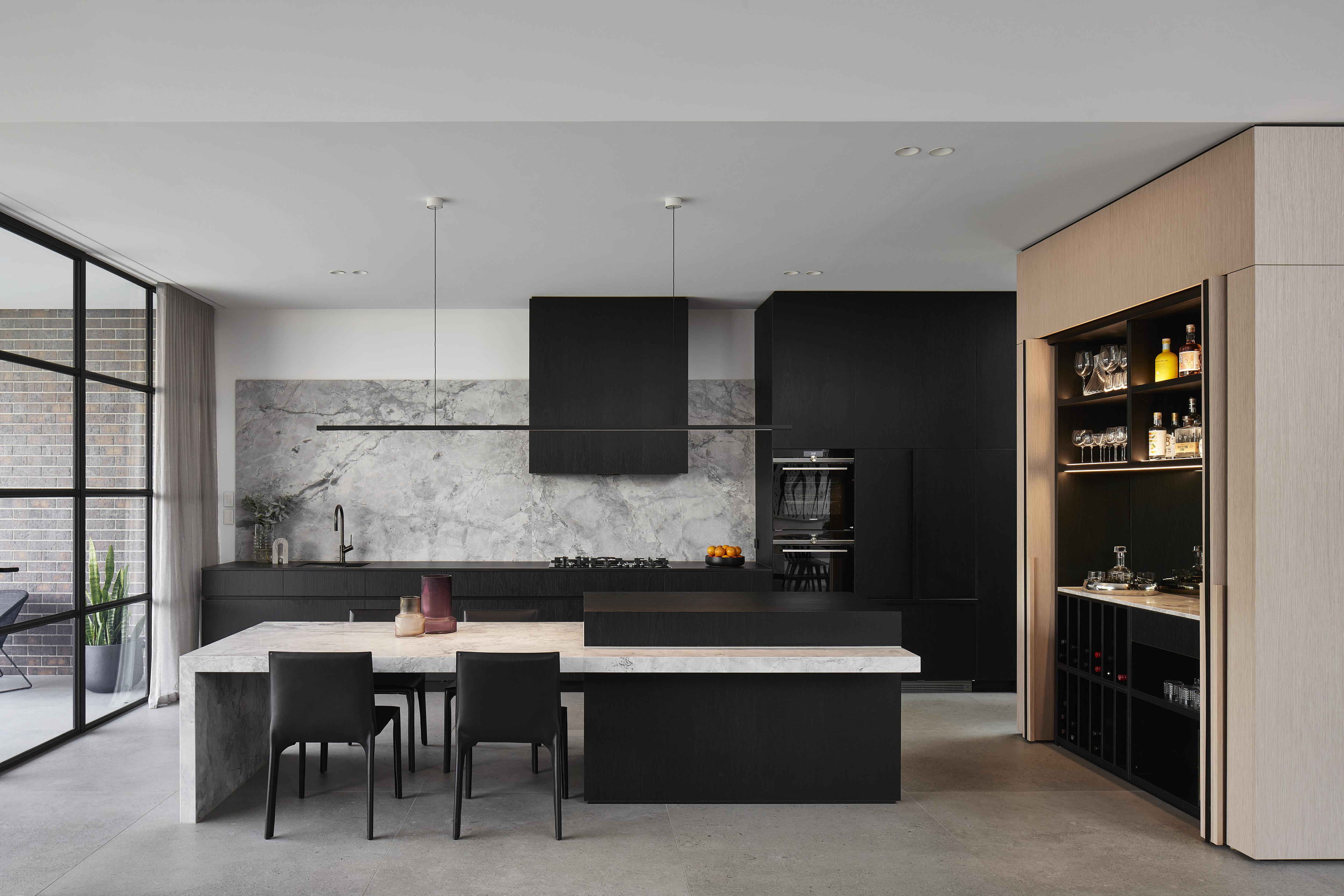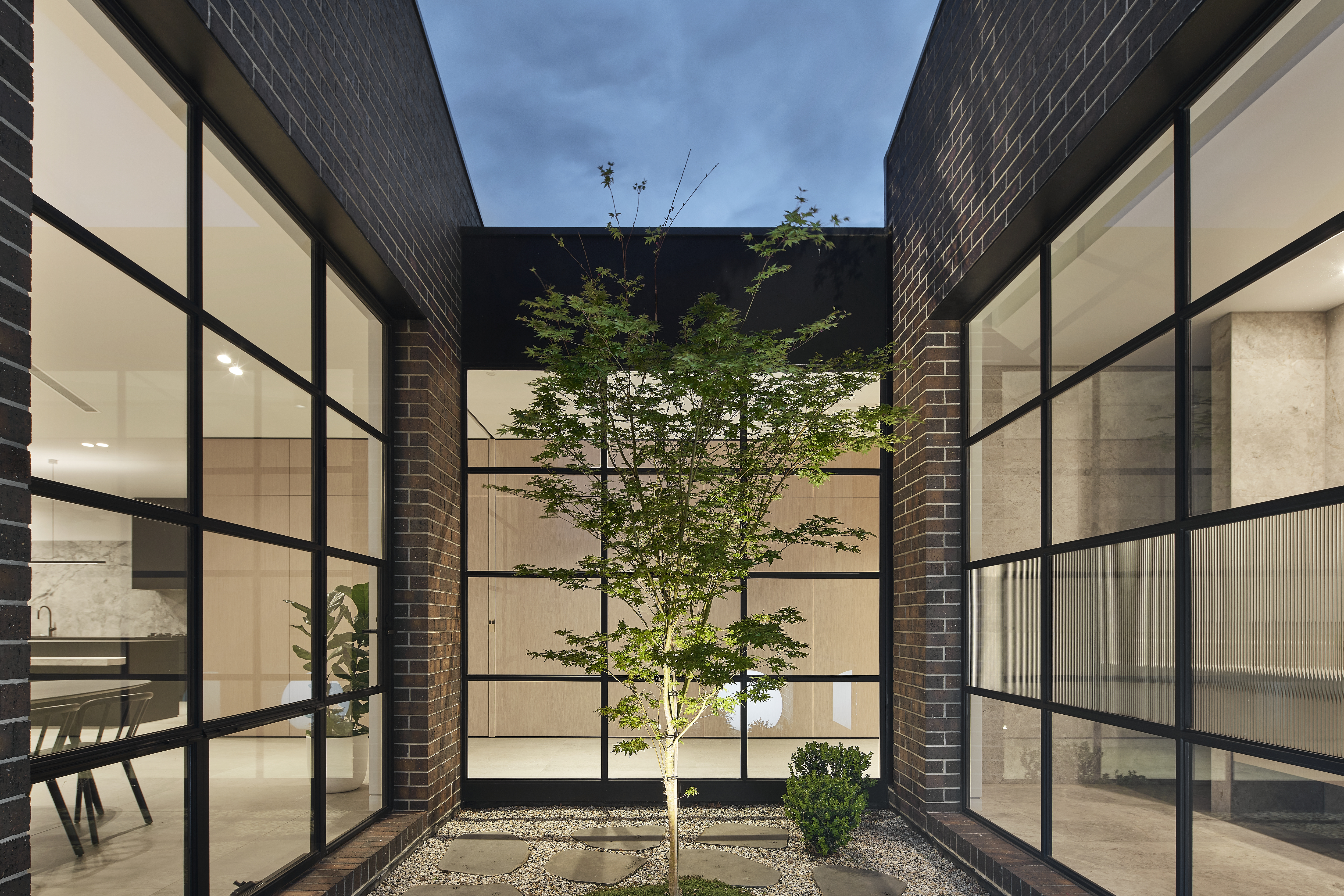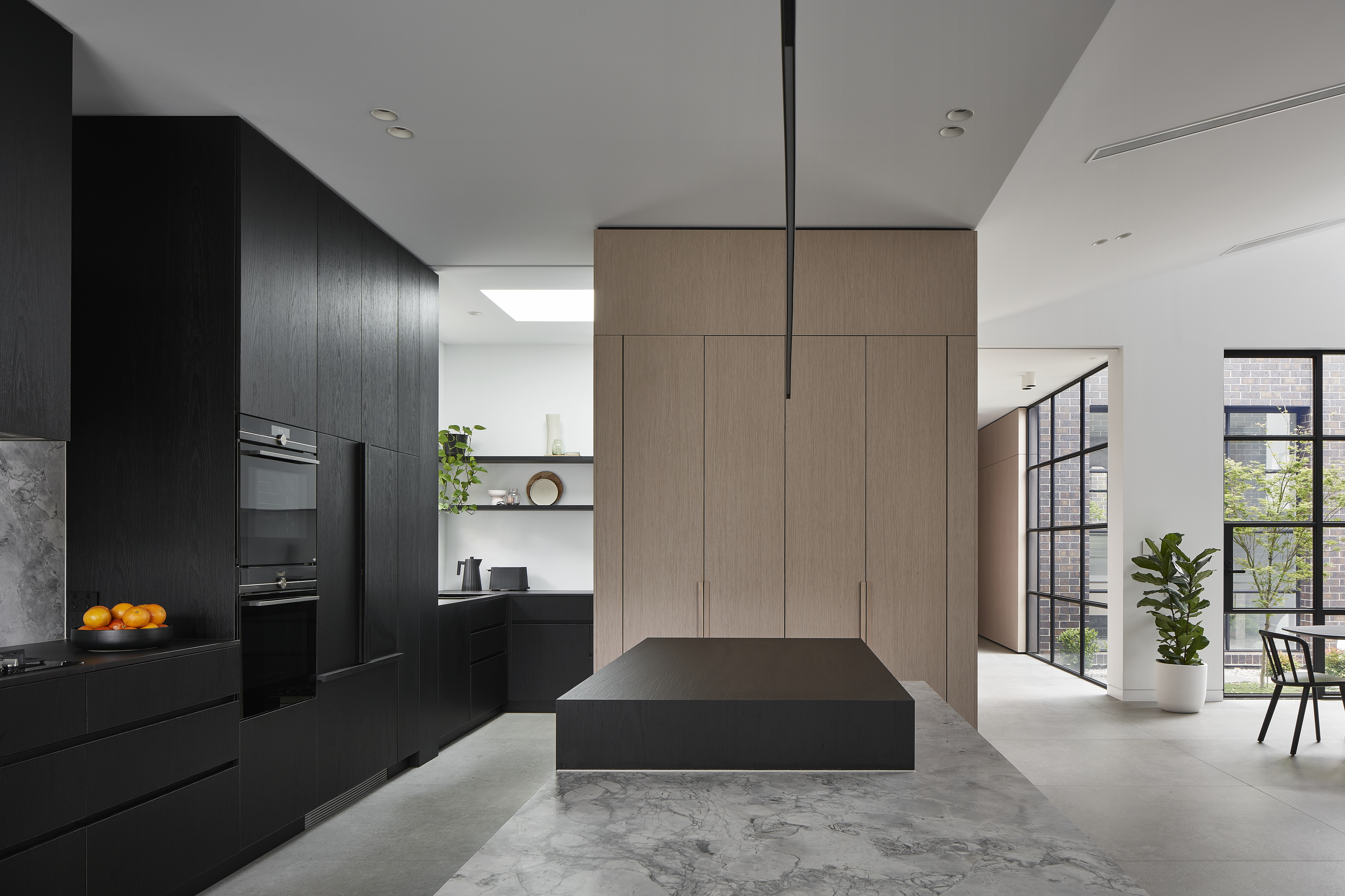 An architecturally designed single-storey new build, featuring striking face brick walls, raked ceilings, marble-detailed bathrooms, black steel windows and a strong sense of privacy.