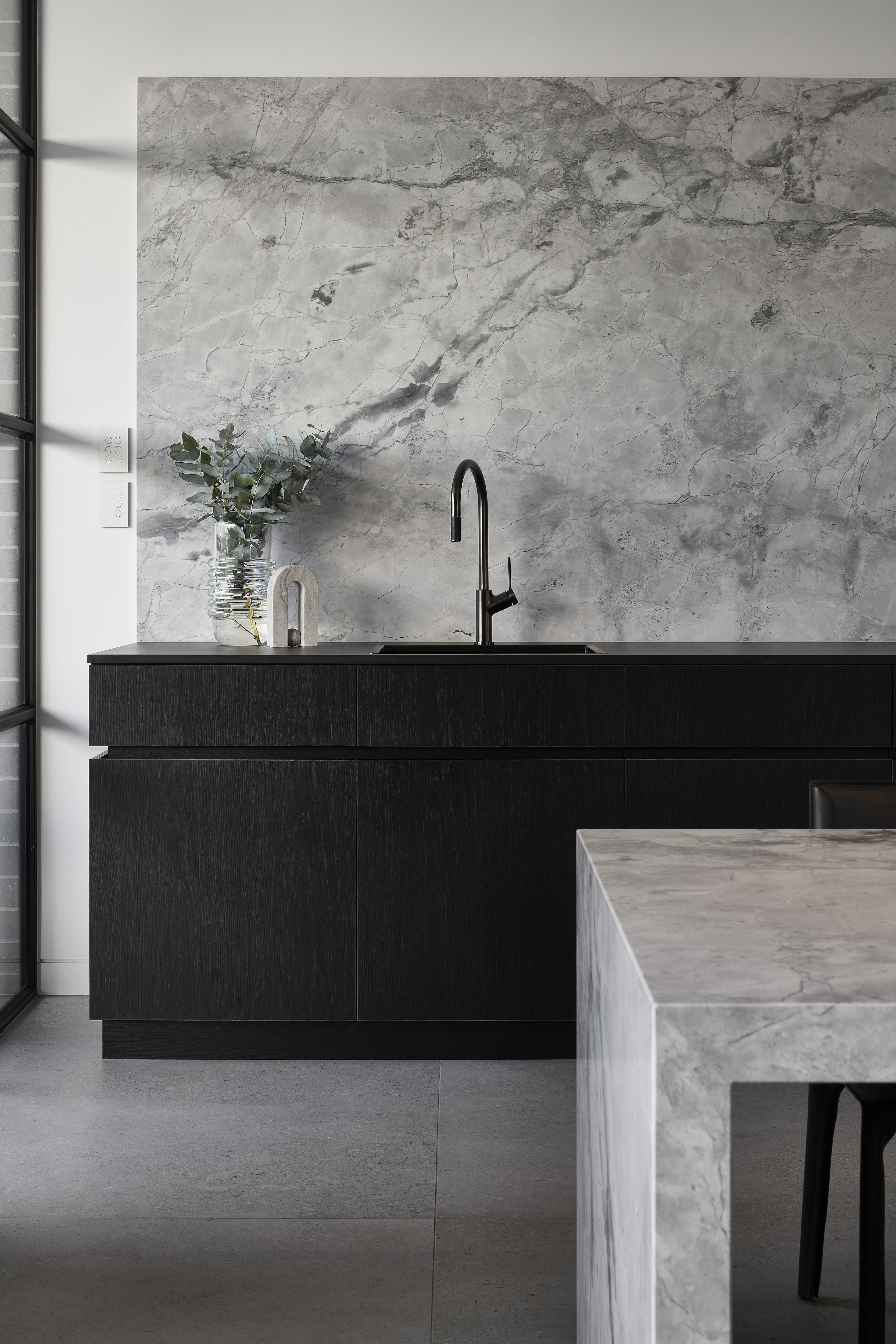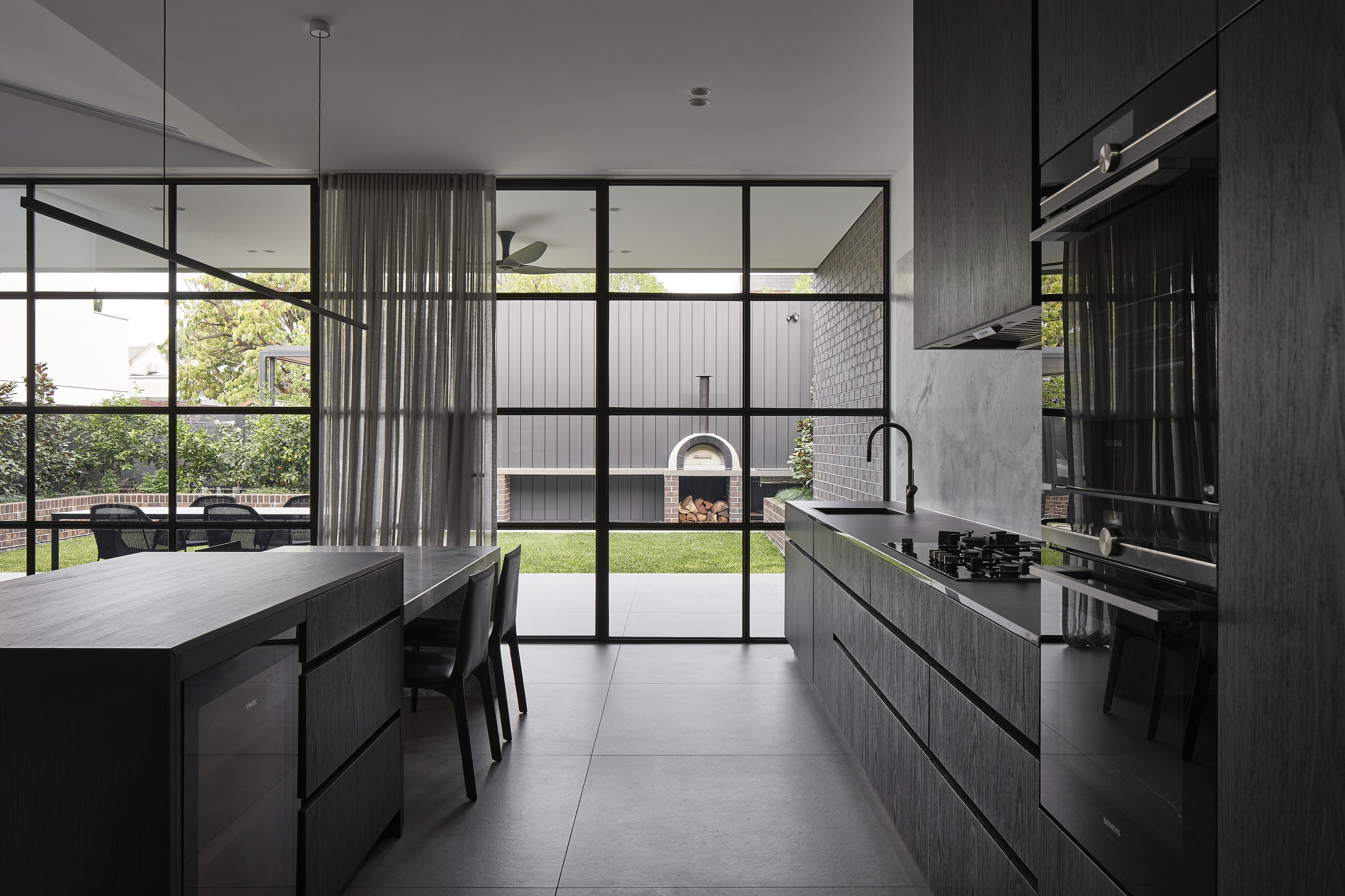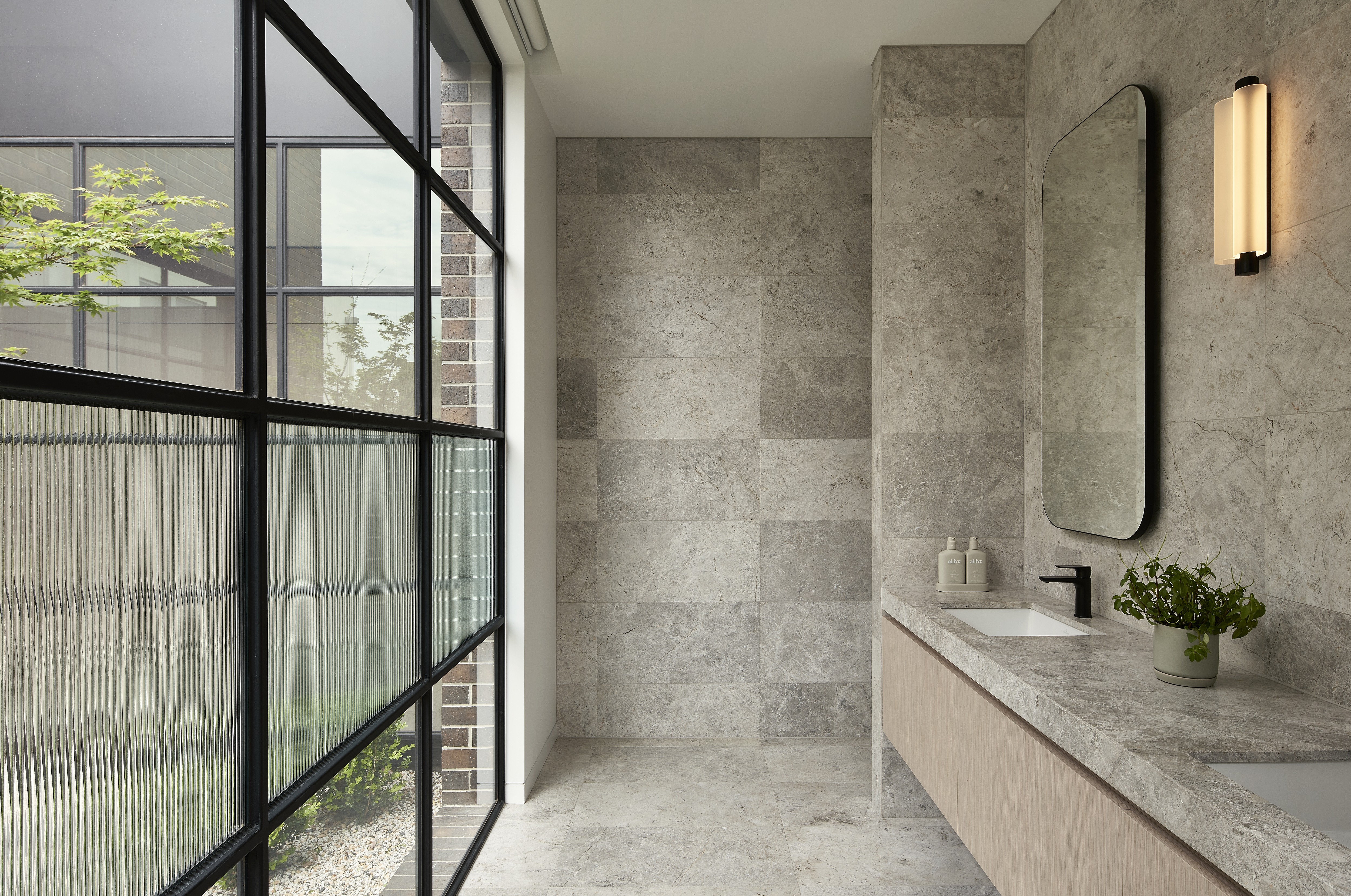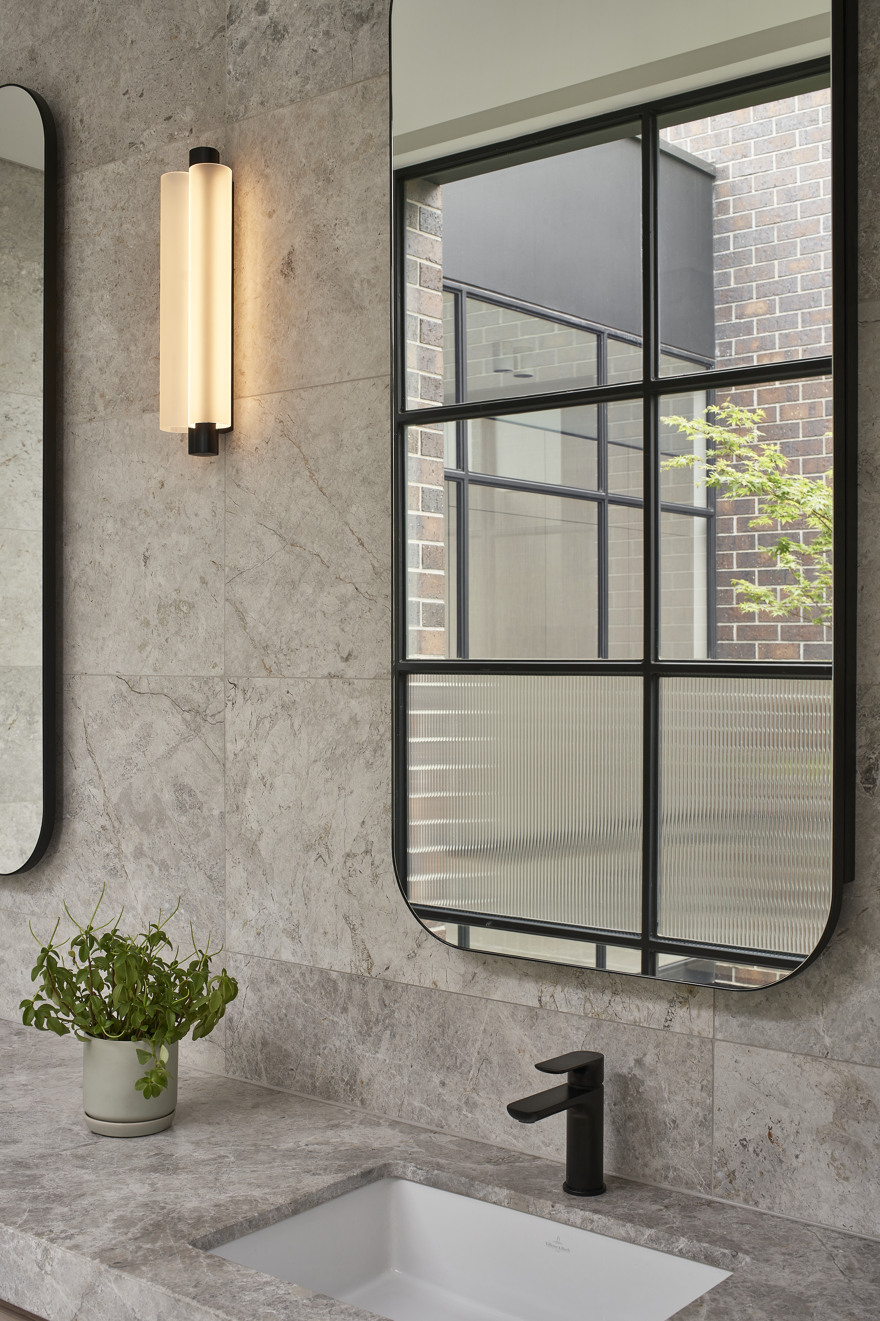 An architecturally designed single-storey new build, featuring striking face brick walls, raked ceilings, marble-detailed bathrooms, black steel windows and a strong sense of privacy.