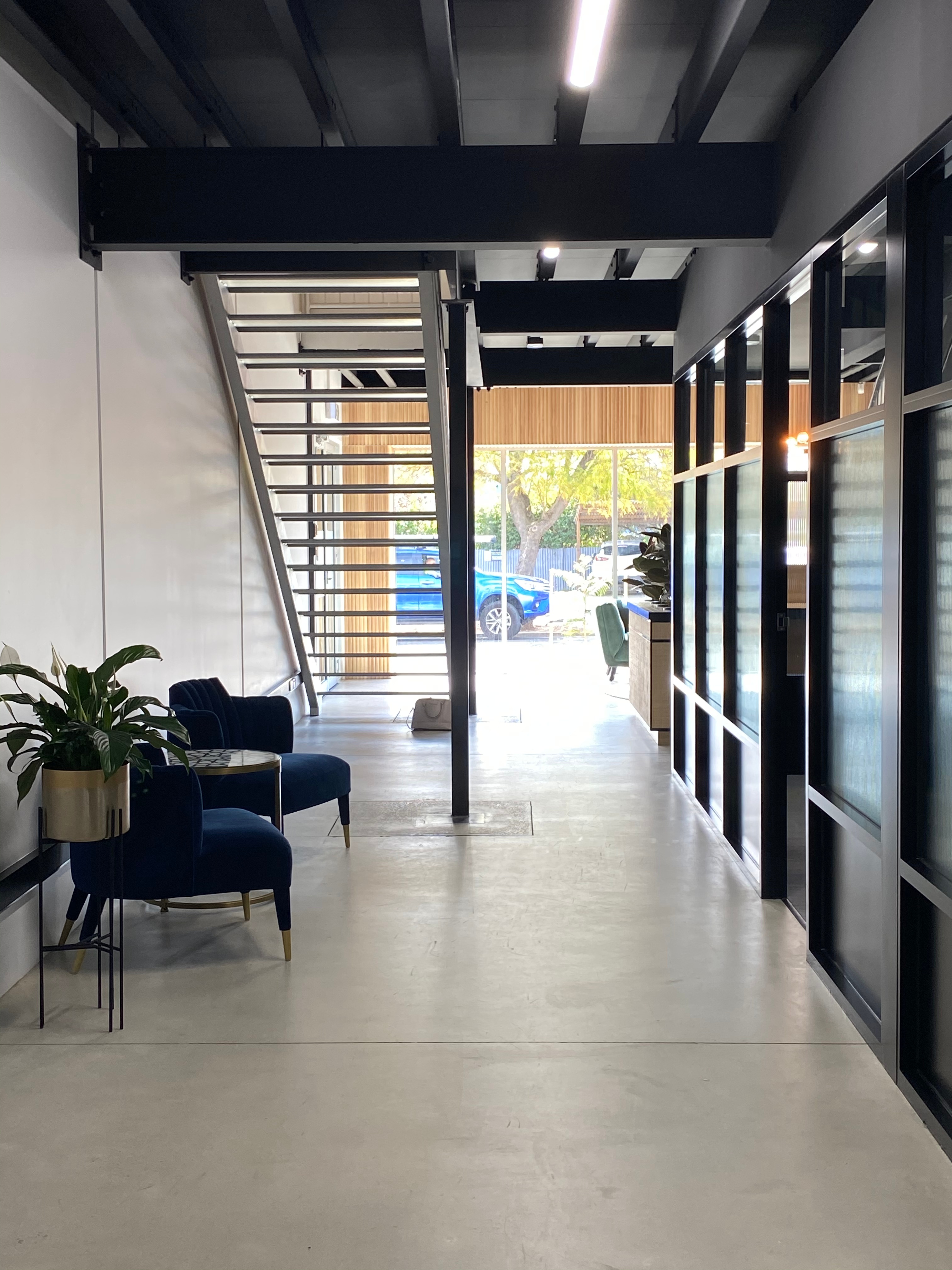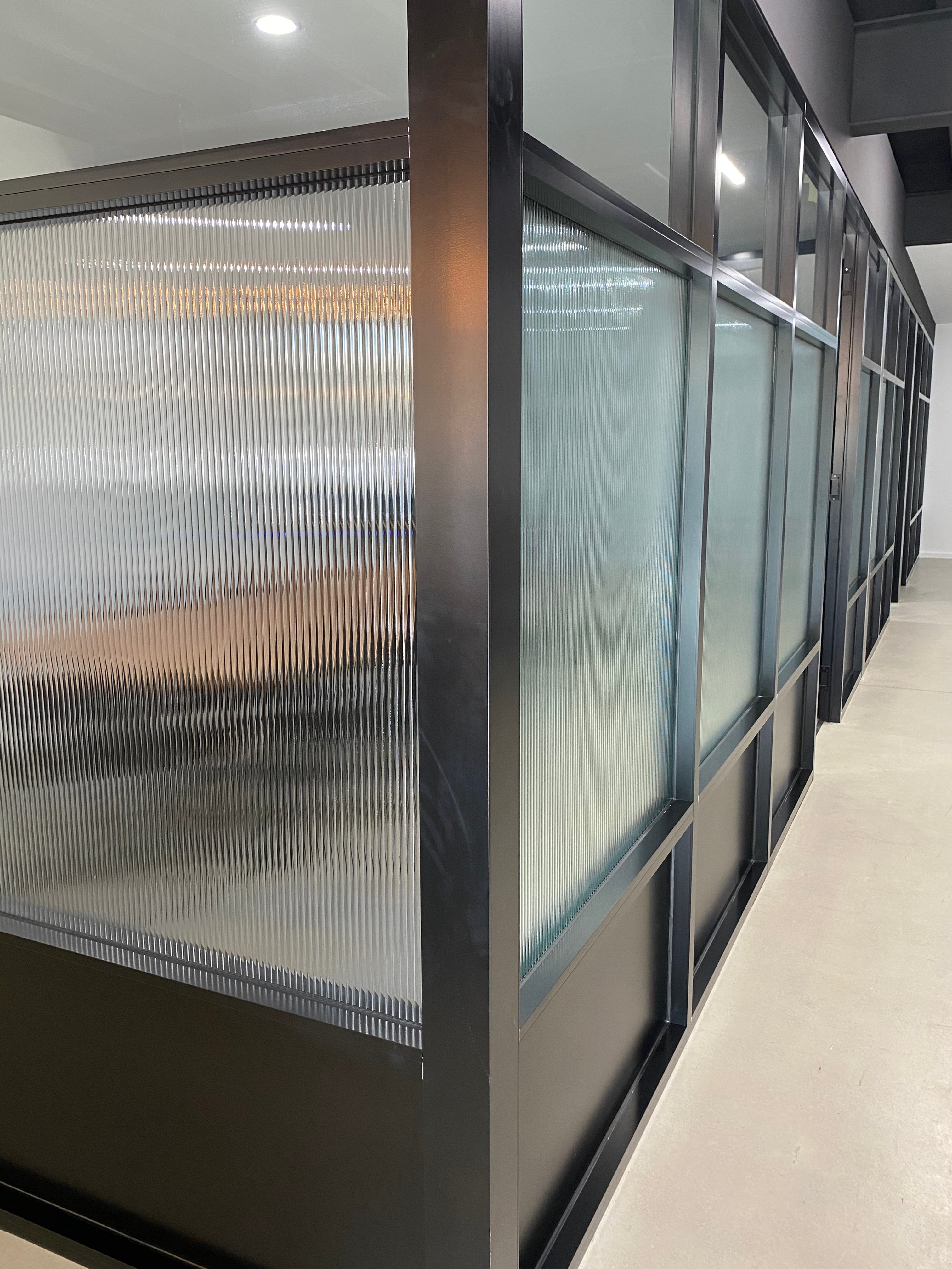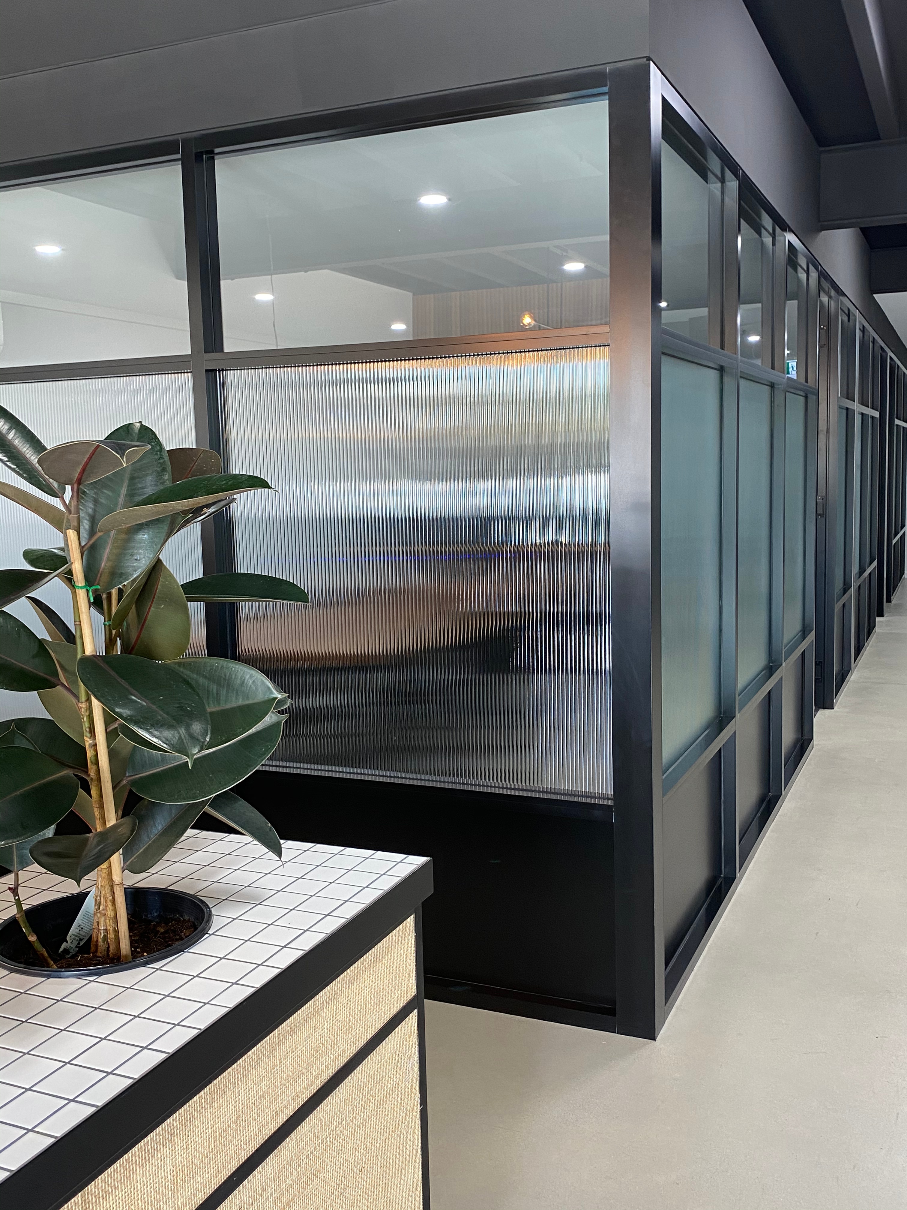 An office fit-out tailored to a client in the financial sector, featuring meeting rooms with fluted glass, a stylish breakout area for coffee and a New York loft- inspired aesthetic.